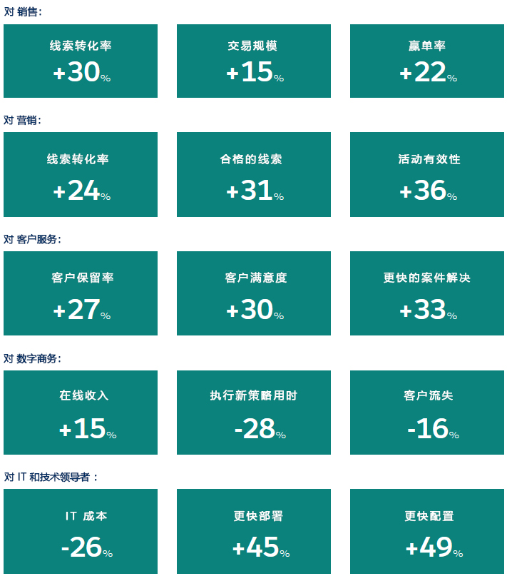 事實證明,引入 在線CRM系統 會產生實際效果,包括直接改善效益。 使用 Salesforce CRM軟件,所有企業規模的全球客戶在生產以下方面都有良好的記錄: