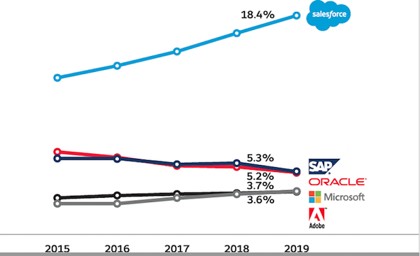 • Salesforce繼續在全球客戶關系管理領域占據主導地位,其市場份額從2018年的16.8%增至2019年的18.4%。