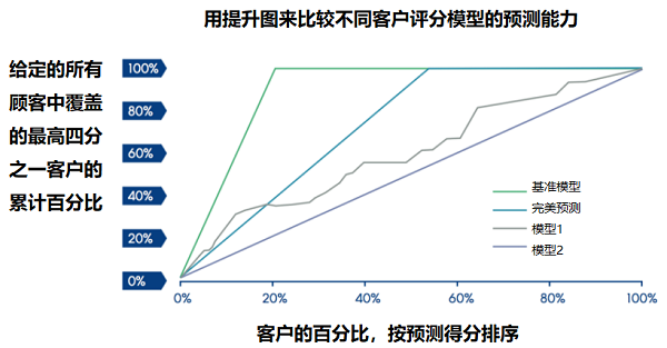 提升圖通過比較在該模型上得分高的客戶也是好客戶的可能性來顯示評分模型的預測能力。提升率是指根據歷史數據,由該模型獲得高分的客戶實際上是一個好的客戶的可能性提高了。如果這個模型完全沒有預測能力,則可能性本質上是隨機選擇的對象,其提升率為零。