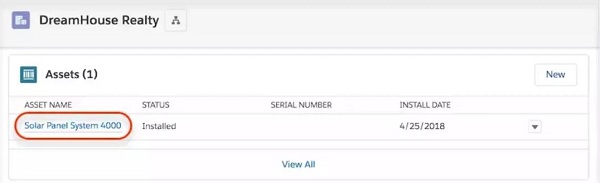 如圖,在DreamHouse Realty的客戶有個關聯的對象"資產"(Assets)。我們可以在Asset中跟蹤已經銷售給客戶的太陽能電池板的信息(Solar Panel System 4000)