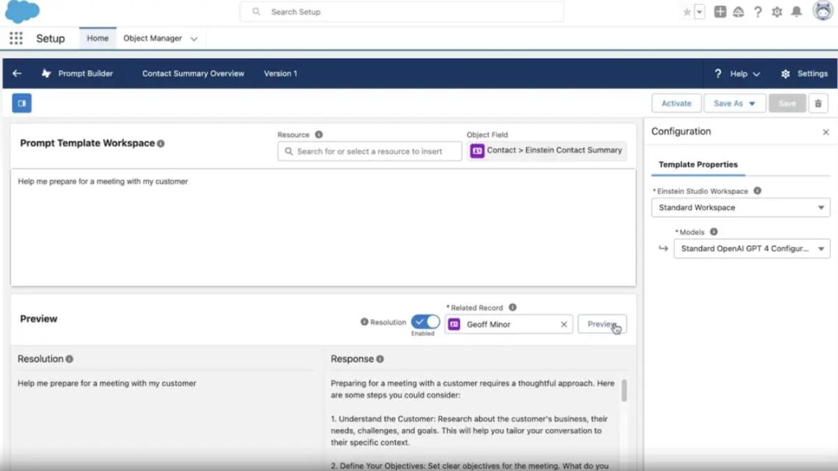 例如,通過Prompt Builder,用戶可以設計一個按鈕,該按鈕可以直接嵌入到聯系人記錄界面,讓呼叫中心的工作人員能夠實時訪問某個客戶案例的全景視圖。